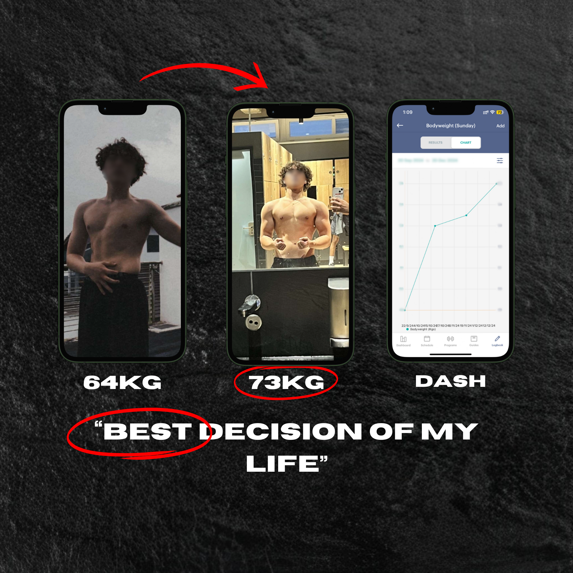 Dante started at 68 kg, training inconsistently and often quitting for weeks at a time. Once we built structure around his workouts and nutrition, he quickly gained 4 kg of lean mass in the first two months. After a short setback, he returned more focused and pushed his lifts higher than ever. Within a few months, Dante had added 10 kg of muscle, proving that real progress comes from consistency — not perfection.